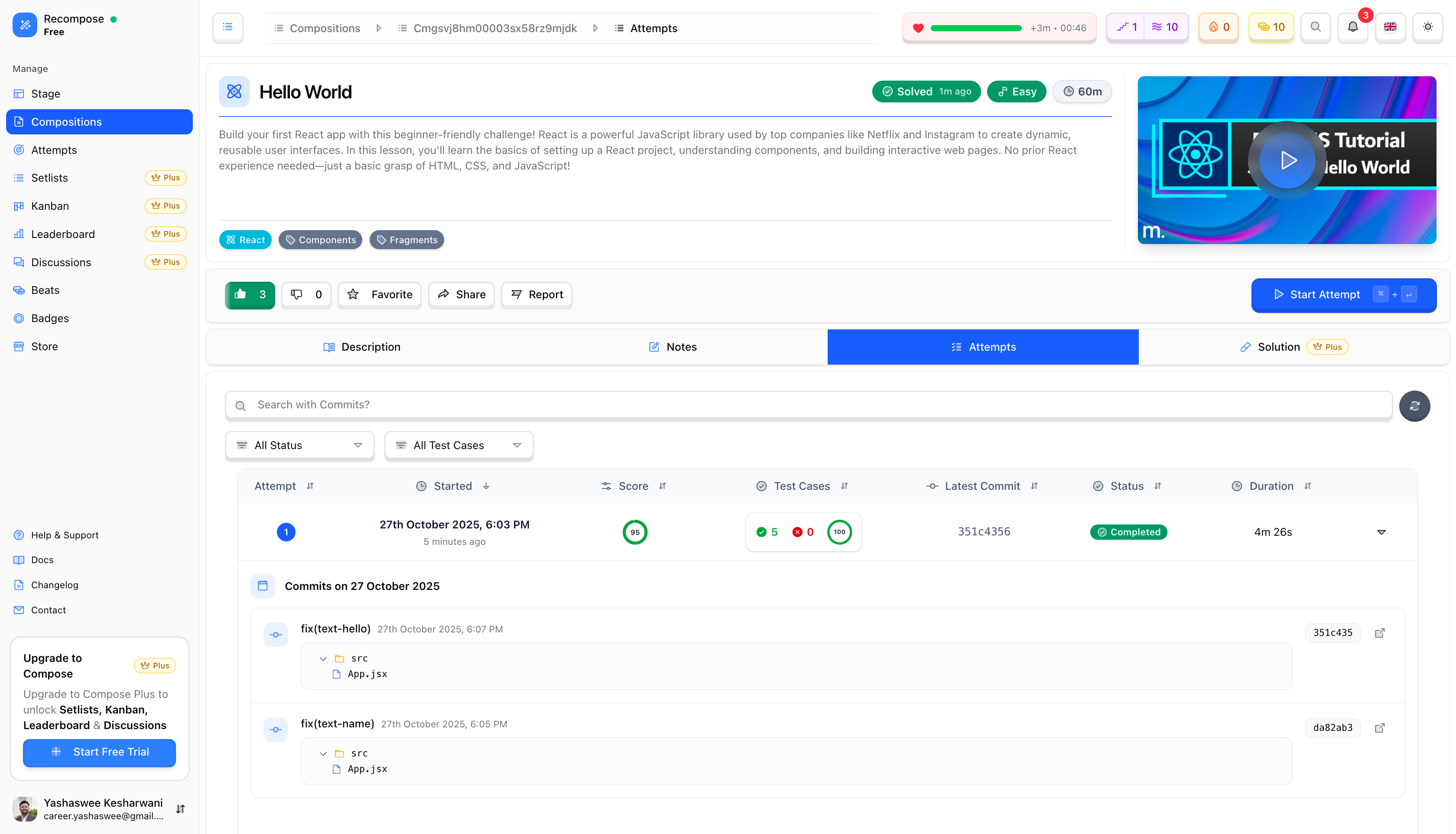 Recompose combines the best of coding challenges, AI analysis, and real-world development practices in one powerful platform.